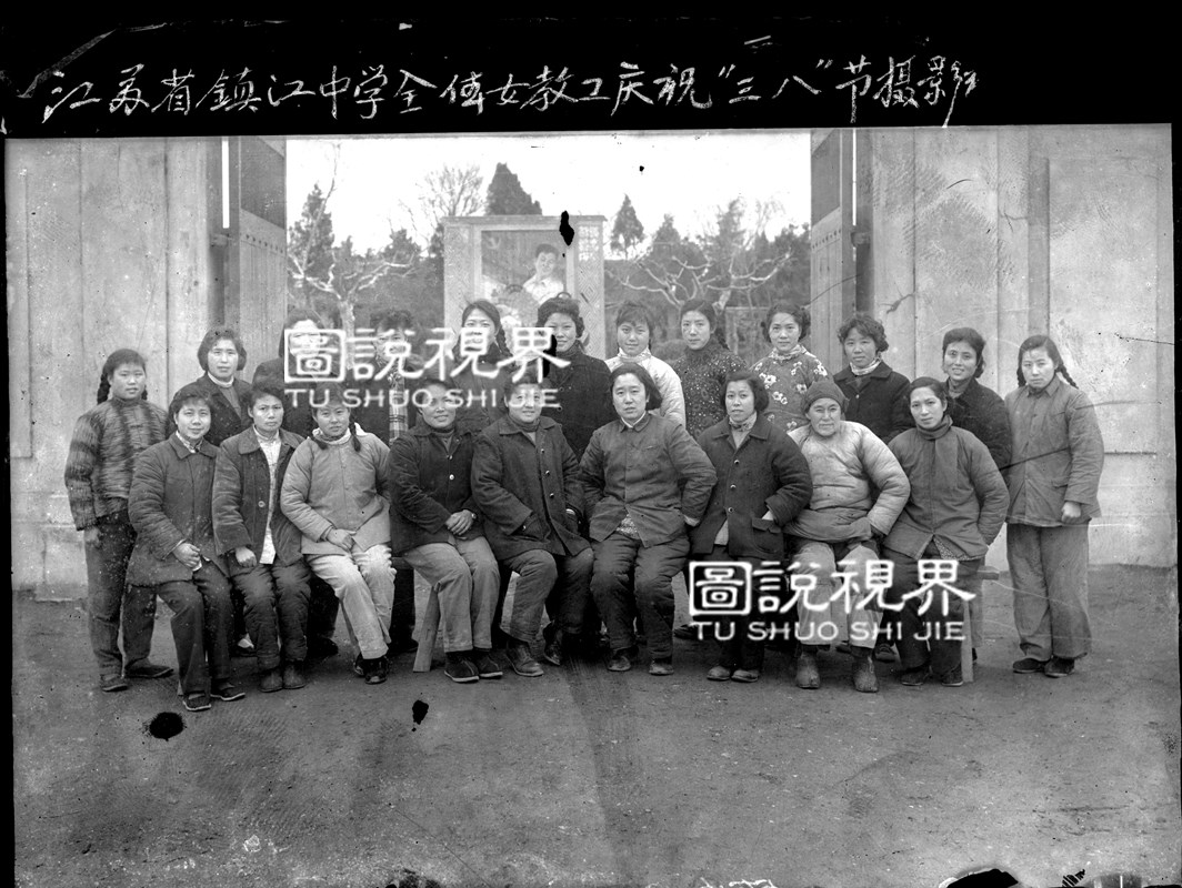 江苏省镇江中学全体女教工庆祝三八节摄影,玻璃底片,6寸页片,照片属直接印相法于底片尺寸同等,摄于镇江中学1965年代,金福根收藏于2025.7.10