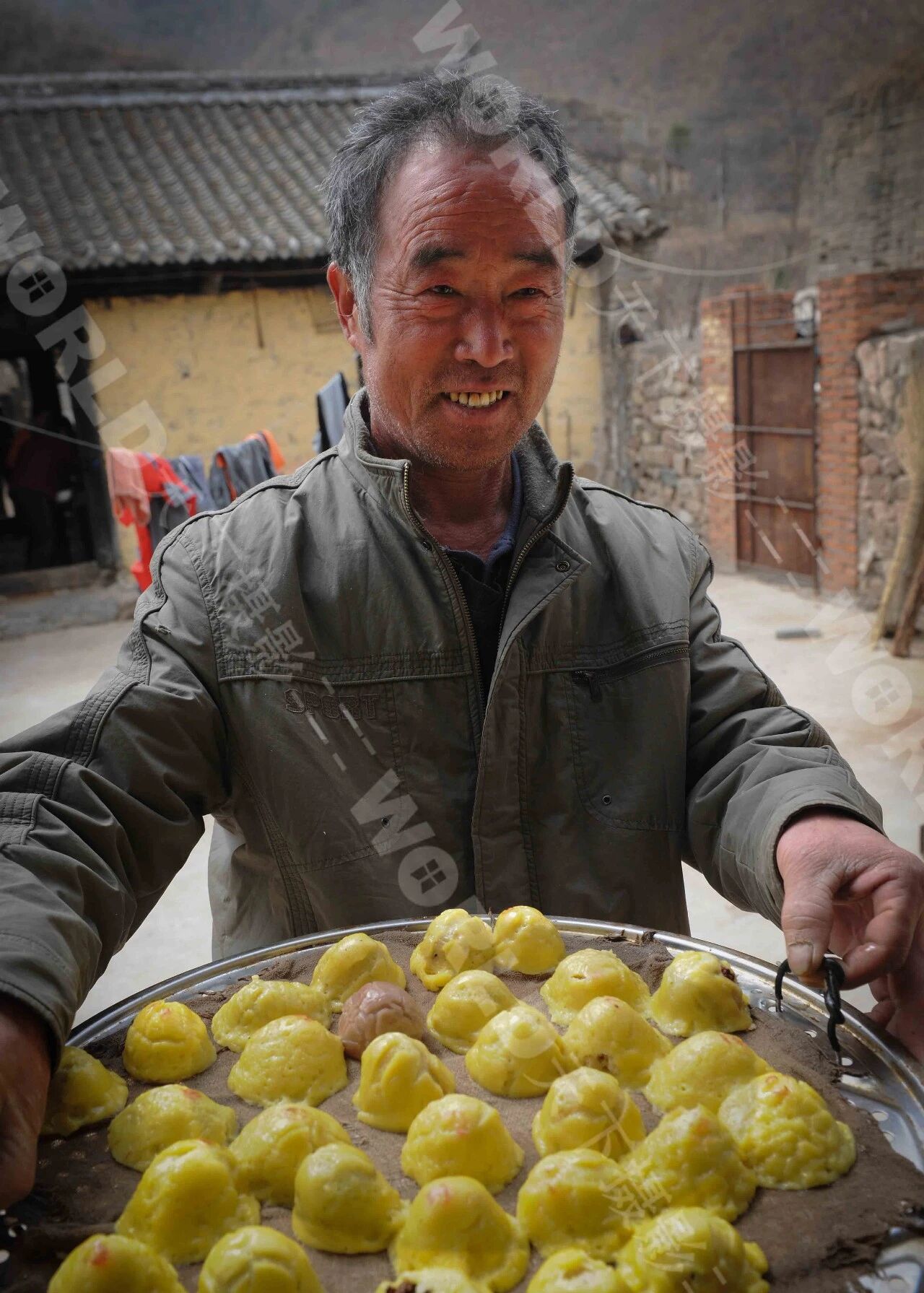 义乌兵后裔吴玉久将刚出锅的粘豆包拿出来招待我们。
