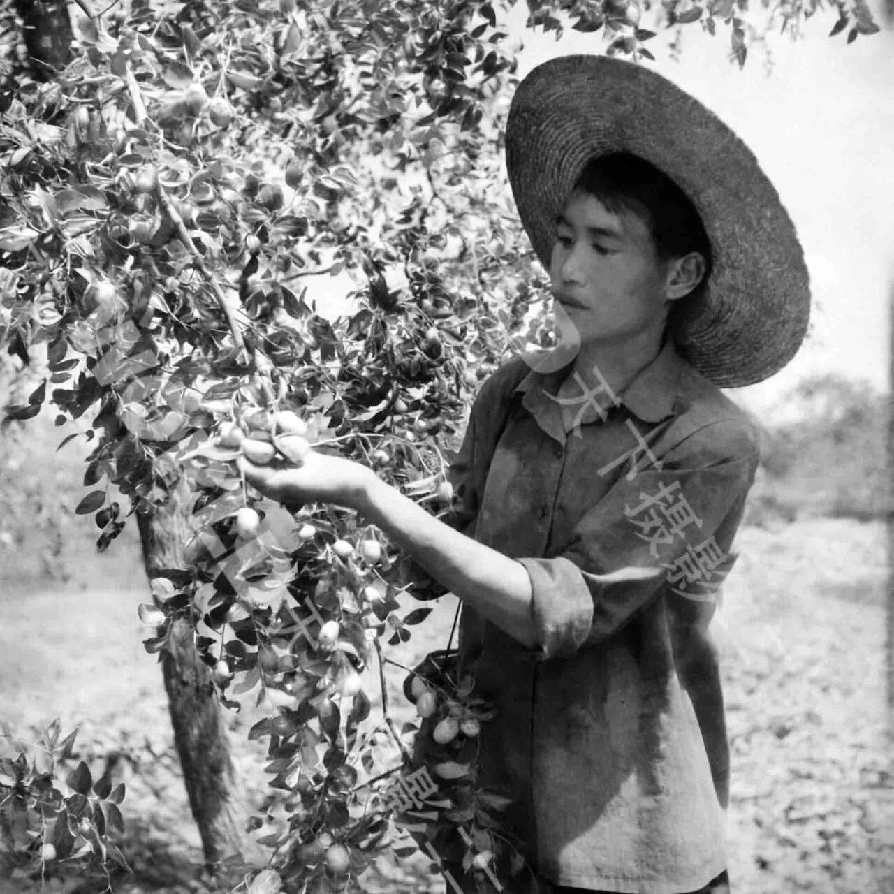 这张照片由摄影家郑运福拍摄于1979年的义乌沙溪,照片中的小伙名叫何允献,正在采摘青枣。嘉庆《义乌县志》卷19中有记载“枣,邑所产呼南枣,实大而核细。”下骆宅乡杏园村《松林骆氏宗谱》记有“万历甲申年拨荣公祀产‘枣园地五分’”。可见义乌县400年前种植大枣已有一定规模。建国后,1958年鲜枣产量达3450吨。1960年到1964年,产量逐年下降,仅产鲜枣256吨。1965年产量恢复,加上年景好,全县1.75万亩枣园共产青枣3743吨,为有记录以来最高数字。